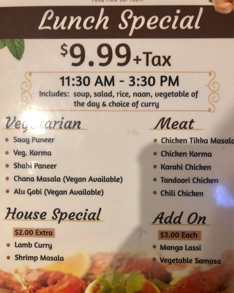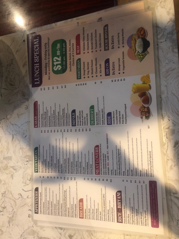 Introducing the menu at Tandoori Hut, a Pakistani-Indian-Halal restaurant located in San Diego, CA. This casual eatery offers a variety of appetizers like Vegetable Samosa, Chicken 65, and Shrimp Pakora. Their bread selection includes flavorsome options like Garlic Naan and Cheese Naan. Vegetarian dishes like Matter Paneer and Bengan Bhartha are flavorful and satisfying. Customers rave about the creamy Tikka Masala and spicy Vindaloo dishes. The ambiance is described as peaceful and family-friendly. Reviews praise the generous portions and attentive service. With a focus on authentic flavors and quality ingredients, Tandoori Hut is a must-visit for Indian food enthusiasts seeking a memorable dining experience.